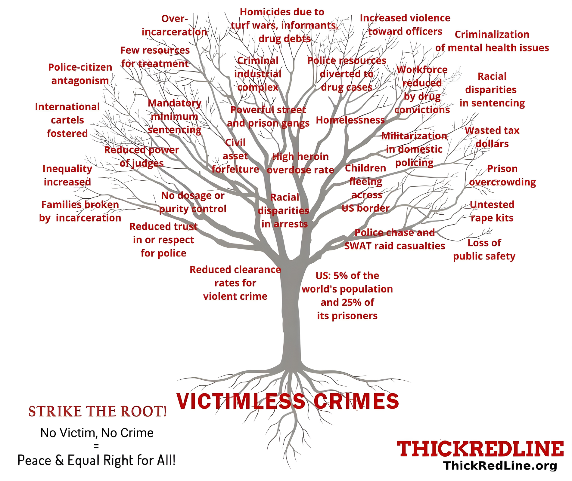 The THICKREDLINE Project is an effort to restore respect for law enforcement by abolishing victimless crime. Victimless crimes are not really crimes… and make the cops the criminals. A real crime, by definition, has a perpetrator and a victim: murder, assault, rape, theft, and extortion are all obvious crimes because there is a victim. Politicians and bureaucrats frequently institute illogical, immoral and counter-productive “laws” (politician scribbles) that penalize peaceful, non-violent people for “crimes” that have no victim. Drug possession, gambling, and making arrests for ignoring Covid-19 lockdown and social distancing orders are examples of victimless crimes where politicians attempt to get the police to use violence immorally and preemptively on overwhelmingly peaceful people frequently to raise revenue or enforce their version of morality on a population. When the police use violence and coercion against peaceful people for victimless crimes (there is simply no way to sugar-coat this) it makes the cops the criminals who are engaged in kidnapping and extortion under the color of law. The THICKREDLINE Project is organizing the police to say: NO! to the organized crime “government” on lockdowns, mask mandates and other victimless crimes.