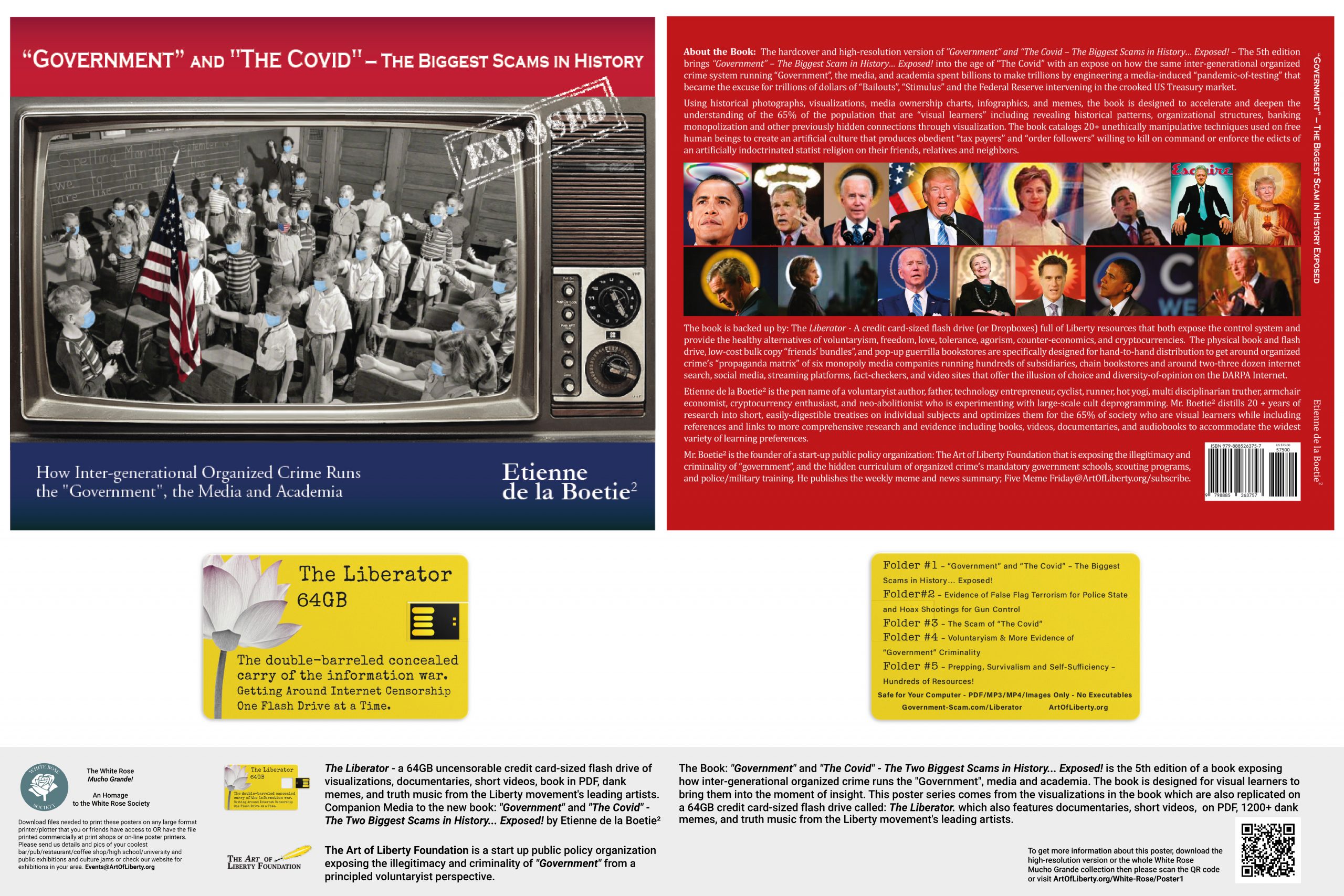 The Book: “Government” – The Biggest Scam in History… Exposed! is the 5th edition of a book exposing how inter-generational organized crime runs the “Government,” media and academia. The book is designed for visual learners to bring them into the moment of insight. This poster series comes from the visualizations in the book, which are also replicated on a 64GB credit card-sized flash drive called: The Liberator. which also features documentaries, short videos, books on PDF, 1500+ dank memes, and truth music from the Liberty movement’s leading artists.