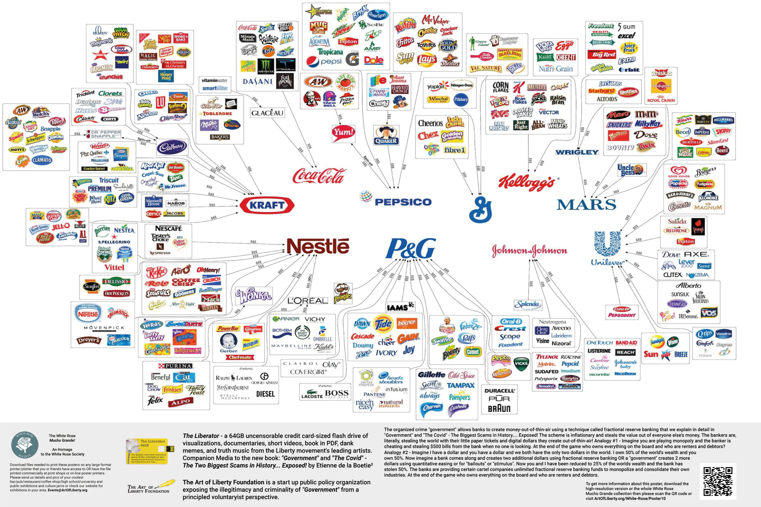 The White Rose – MUCHO GRANDE! Instead of stickers, we have a free file of POSTERS featuring the full-size, high-res visualizations from “Government” – The Biggest Scam in History… Exposed!, a book revealing how inter-generational organized crime runs the “government,” media and academia, and a series of visualizations showing the monopolization of: media, consumer goods, defense contractors, beer, beverages, meat processing, airlines, community newspapers, and banks among others. The posters are designed to be exhibited in coffee shops, university commons, and other high-traffic locations, including liberty festivals, conferences and events in a decentralized manner by any activist that understands the power of visualization.