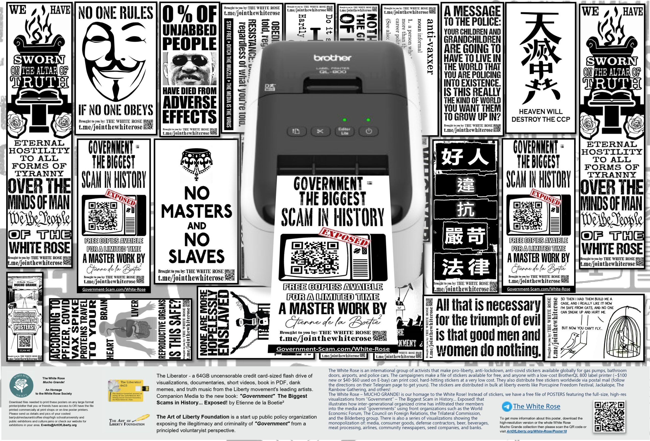 The White Rose is an international group of activists that make pro-liberty, anti-lockdown, anti-covid stickers available globally for gas pumps, bathroom doors, airports, and police cars. The campaigners make a file of stickers available for free, and anyone with a low-cost BrotherQL 800 label printer (~$100 new or $40-$60 used on E-bay) can print cool, hard-hitting stickers at a very low cost. They also distribute free stickers worldwide via postal mail (follow the directions on their Telegram page to get yours). The stickers are distributed in bulk at liberty events like Porcupine Freedom Festival, Jackalope, The Rainbow Gathering, and others!