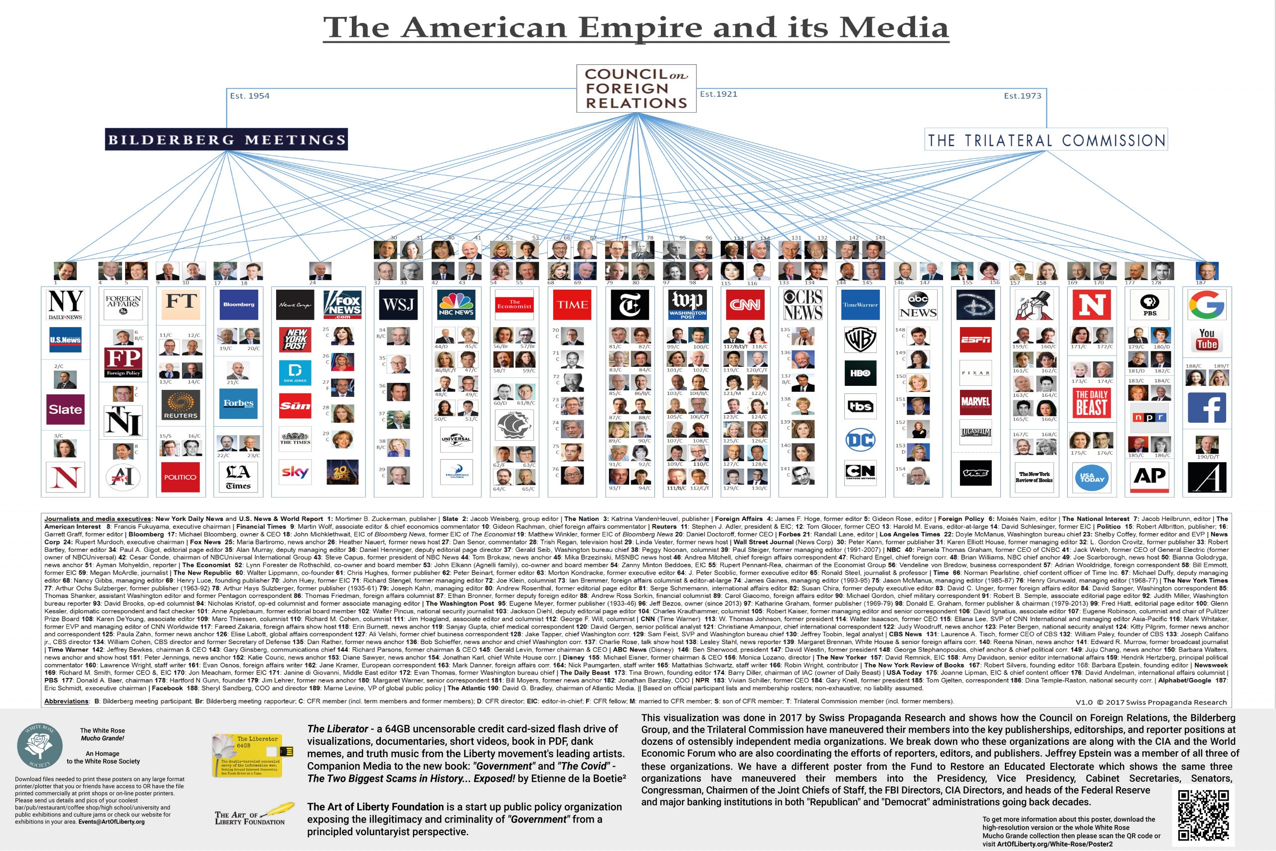 This visualization was done in 2017 by Swiss Propaganda Research and shows how the Council on Foreign Relations, the Bilderberg Group, and the Trilateral Commission have maneuvered their members into the key publishers, editors, and reporter positions at dozens of ostensibly independent media organizations. We break down who these organizations are along with the CIA and the World Economic Forum, who also coordinate the efforts of reporters, editors, and publishers. Jeffrey Epstein was a member of all three of these organizations. We have a different poster from the Fund to Restore an Educated Electorate, which shows the same three organizations have maneuvered their members into the Presidency, Vice Presidency, Cabinet Secretaries, Senators, Congressman, Chairmen of the Joint Chiefs of Staff, FBI Directors, CIA Directors, and heads of the Federal Reserve and major banking institutions in both “Republican” and “Democrat” administrations going back decades.