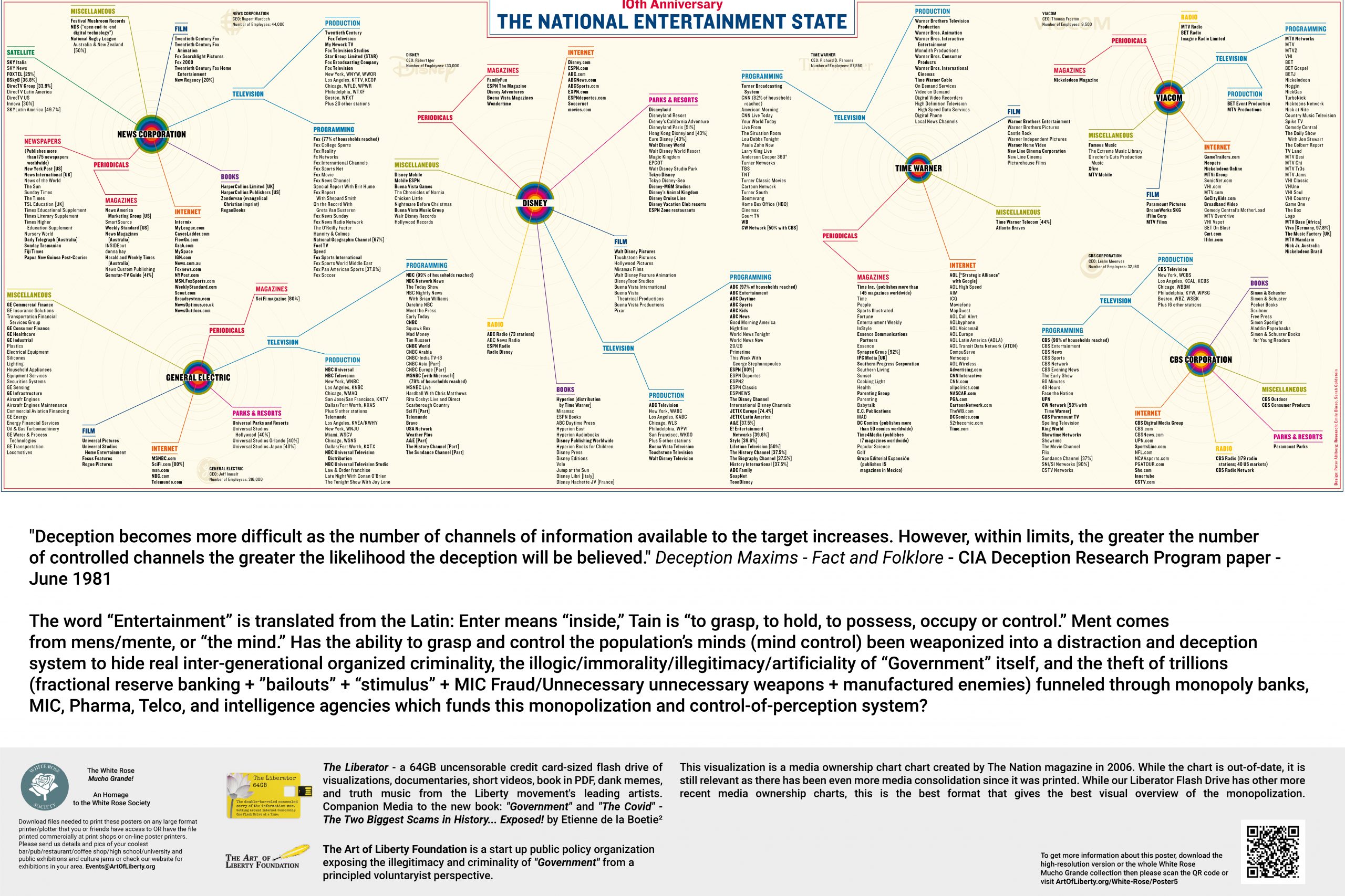 The White Rose – MUCHO GRANDE! Instead of stickers, we have a free file of POSTERS featuring the full-size, high-res visualizations from “Government” – The Biggest Scam in History… Exposed!, a book revealing how inter-generational organized crime runs the “government,” media and academia, and a series of visualizations showing the monopolization of: media, consumer goods, defense contractors, beer, beverages, meat processing, airlines, community newspapers, and banks among others. The posters are designed to be exhibited in coffee shops, university commons, and other high-traffic locations, including liberty festivals, conferences and events in a decentralized manner by any activist that understands the power of visualization.